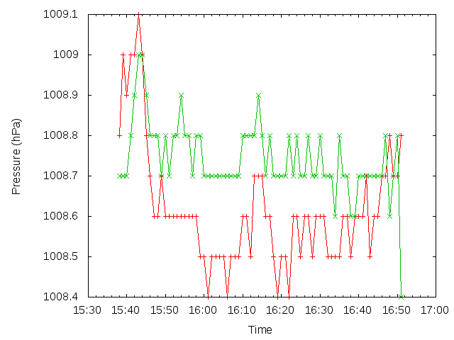 緑:2014年式強制通風式日除けの中に入れた「おんどとり」が測定した気圧