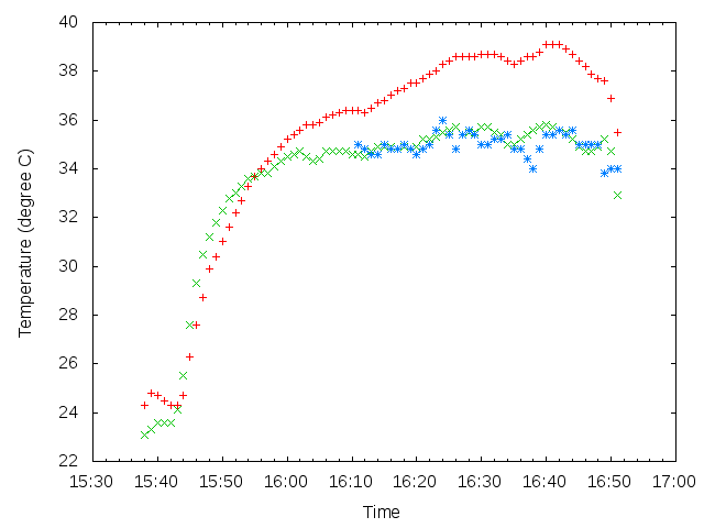 15:40過ぎを境に気温が変化しているのは,空調の効いた室内においてあった「おんどとり」を外に出したためである.外は気温が高いため測定される温度は上昇したが,測器の熱慣性のため気温の測定が落ち着くまでに15分程度の時間がかかっている.強制通風している「おんどとり」(緑)は自然通風の「おんどとり」(赤)に比べると,周囲の気温に馴染むまでの時間が少し短いように見える.これは強制通風によって熱交換がよくなったためと考えられる.