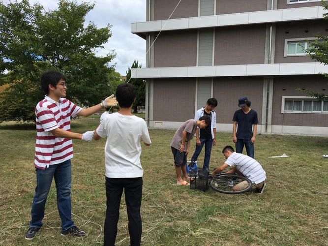 最後におもりに紐をくくりつけて,完成!