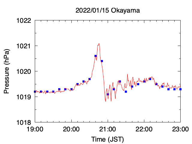 岡山大学に設置した気圧計でも,噴火でつくられた波による気圧の変動が観測されました.
